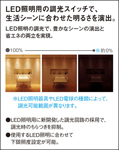 明るさ約0%〜100%の範囲でスムーズに調光できます。(下限照度設定機能で調整が必要です。)